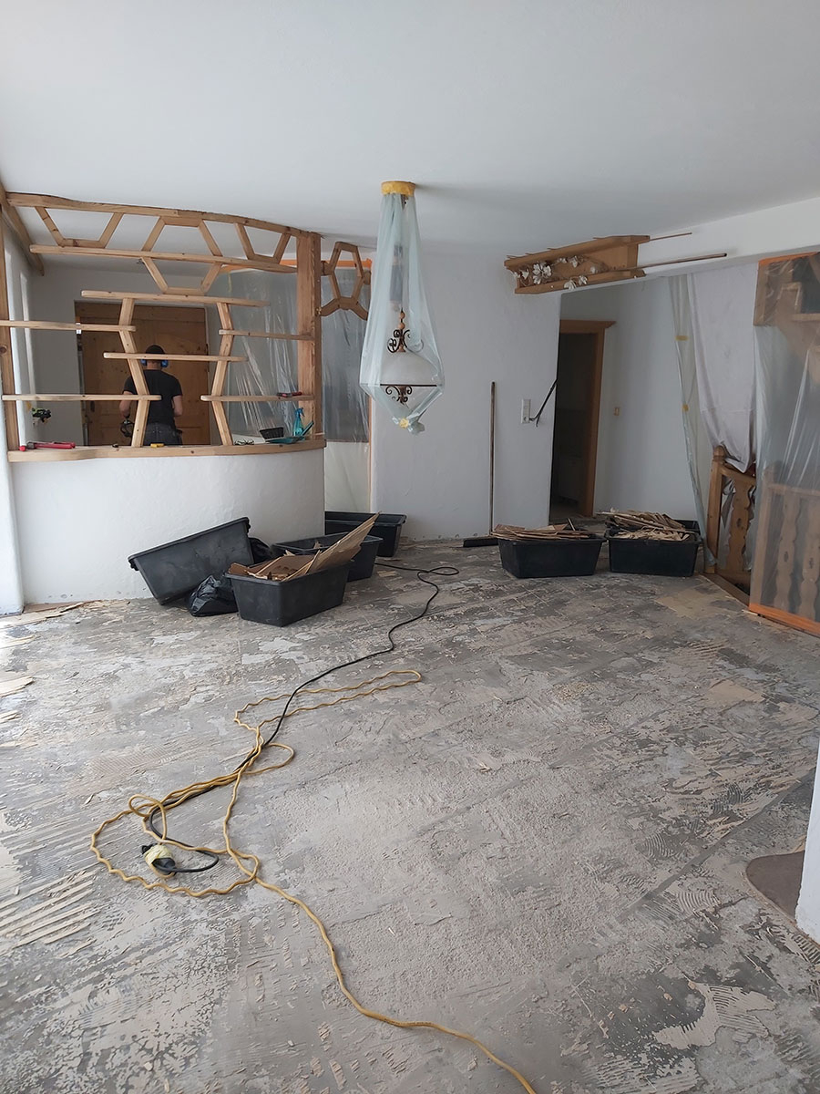 Die gezeigten Bilder vermitteln einen Einblick in unterschiedliche Projekte und Arbeitsphasen der Tiroler Raumausstattungs GmbH. Zu sehen sind verschiedene Bodenbeläge, Materialien und Verlegesituationen – vom vorbereiteten Untergrund über laufende Arbeiten bis hin zu fertiggestellten Bodenflächen.